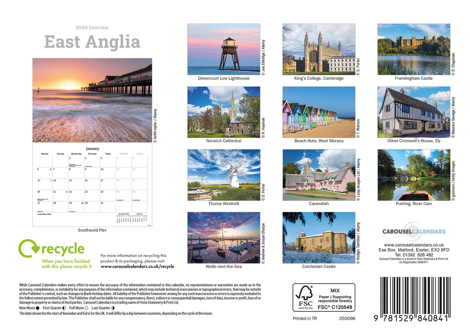 Explore the picturesque landscapes and historic towns of East Anglia with our East Anglia A5 Calendar 2025. Featuring stunning images showcasing the beauty of Norfolk, Suffolk, and Cambridgeshire, this calendar celebrates the charm of England's eastern region. With its A5 size, this calendar is perfect for displaying in smaller spaces and appreciating the scenic wonders of East Anglia throughout the year.