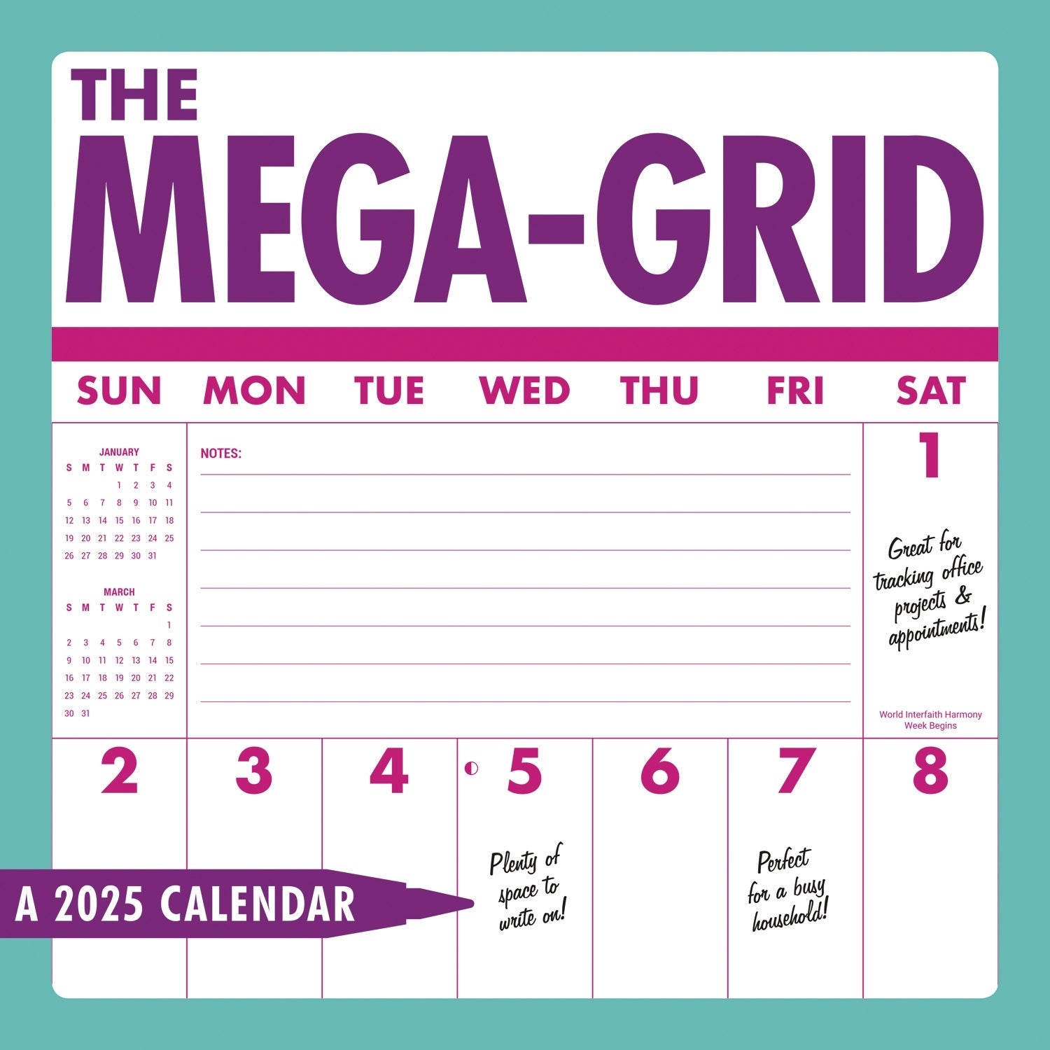 Stay organized and on track with our Mega Grid Wall CalendarSunday Start 2025. Each month features oversized grid squares for easy scheduling and planning, making it ideal for busy individuals and families.