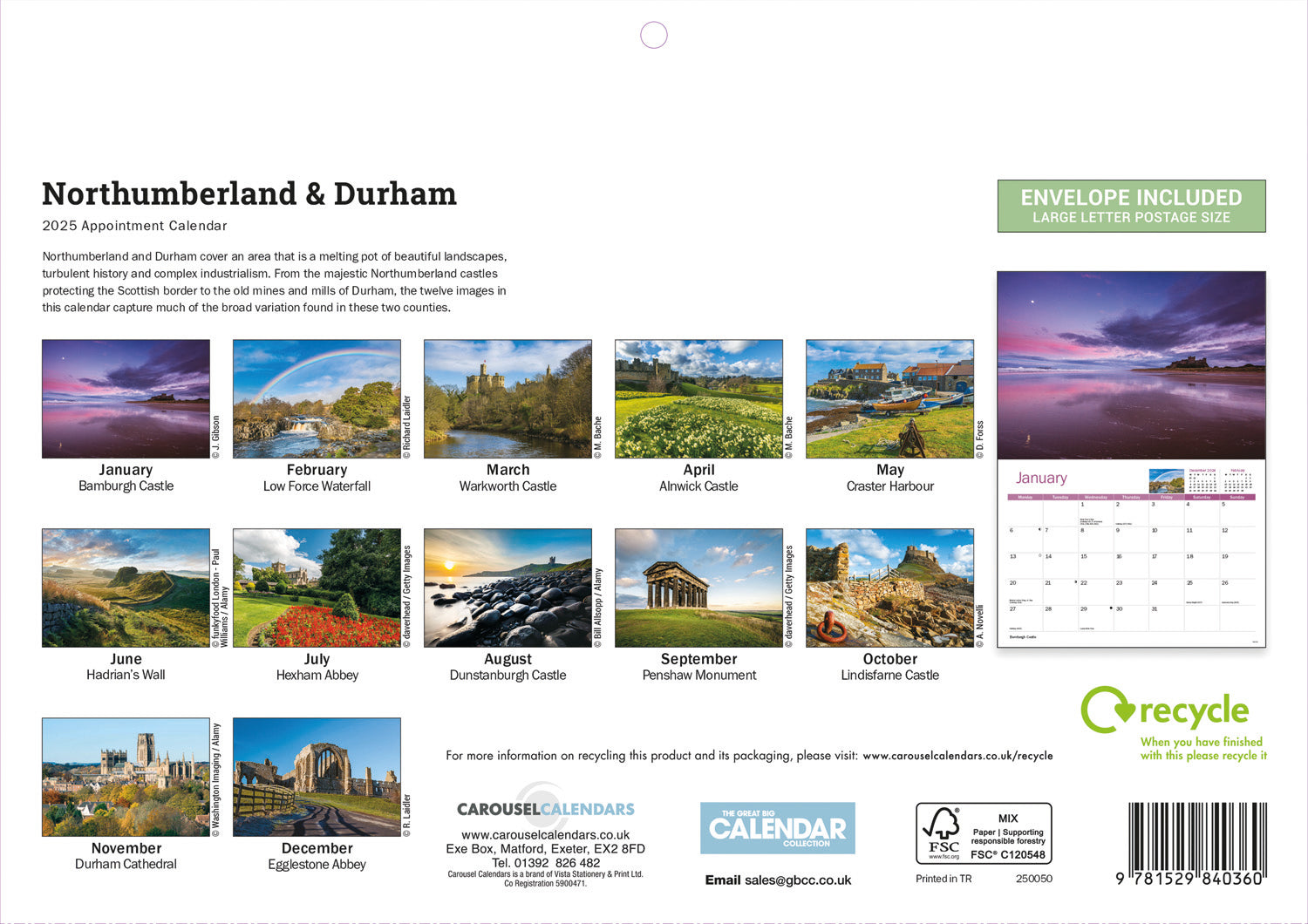 Embark on a journey through the historic counties of Northumberland and Durham with our Northumberland & Durham A4 Calendar 2025. Featuring stunning images capturing the landscapes, castles, and coastline of these North East England regions, this calendar celebrates the rich history and natural beauty of Northumberland and Durham. With its A4 size, this calendar is perfect for displaying in your home or office and exploring the captivating scenery of Northumberland and Durham throughout the year.