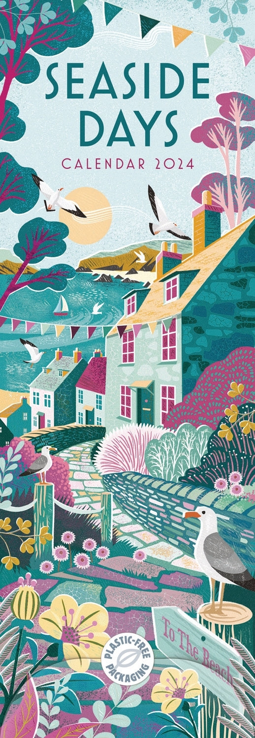 Relax and unwind with the Seaside Days Slim Calendar. Each month features serene coastal scenes, sandy beaches, and azure waters, evoking the tranquility and nostalgia of seaside getaways. Packaged sustainably with plastic-free materials.