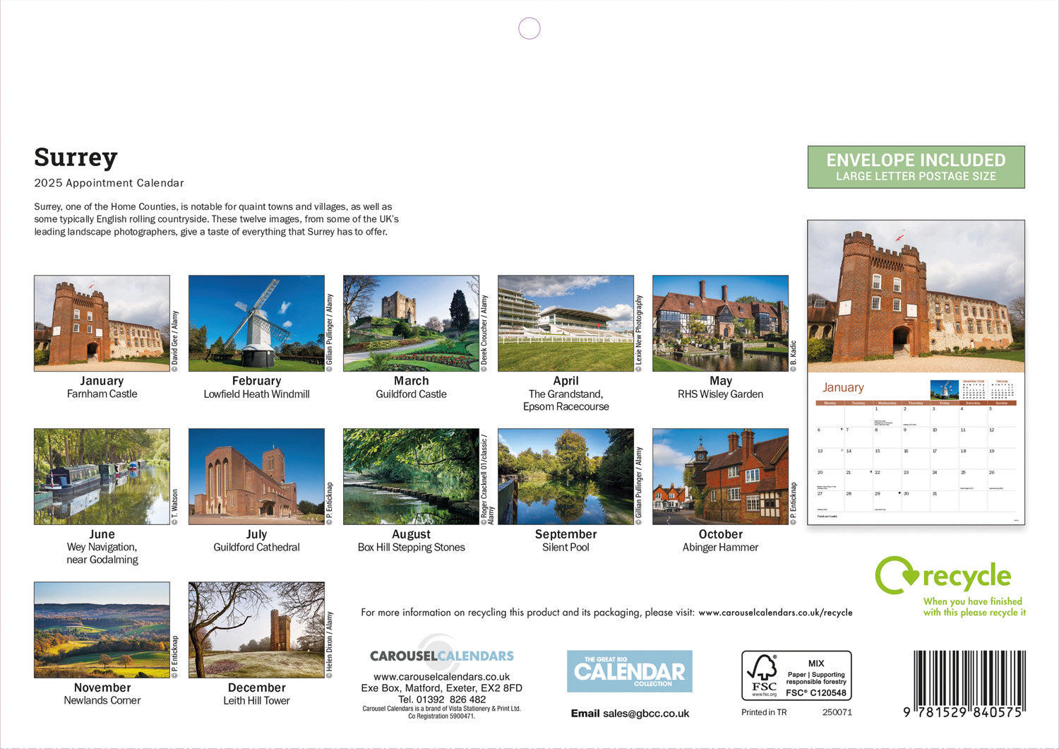 Experience the natural and cultural attractions of Surrey with our Surrey A4 Calendar 2025. Featuring stunning images showcasing Surrey's landscapes, historic landmarks, and vibrant communities, this calendar celebrates the diversity and charm of the county. With its A4 size, this calendar is perfect for displaying in your home or office and exploring the beauty of Surrey throughout the year.
